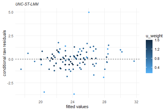 Also, we can fit a t-LMM with diagonal scale matrix for the random effects by using: