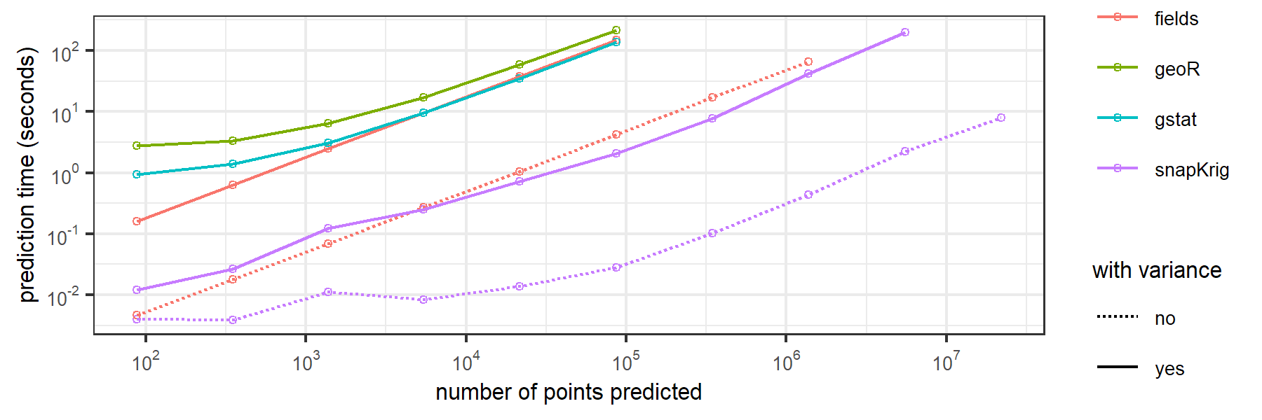 snapKrig uses a computationally lean implementation of a 2-dimensional spatial correlation model for gridded data. By restricting to models with (separable) Kronecker covariance, the package can speed computations on certain likelihood and kriging problems by orders of magnitude compared to alternatives like gstat, fields, geoR, spatial, and LatticeKrig.