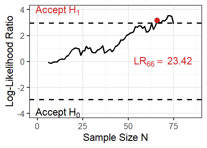 #>  log-likelihood ratio = 2.892, decision = continue sampling