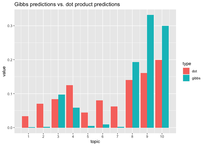 tibble(topic = 1:ncol(p_gibbs), gibbs = p_gibbs[1,], dot = p_dot[1, ]) %>%