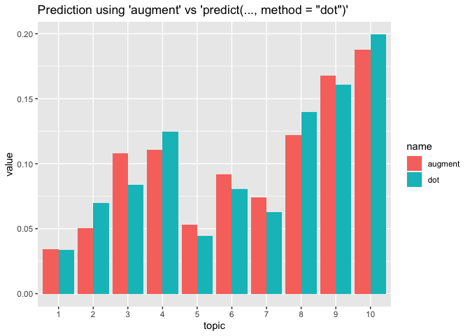 labs(title = "Prediction using 'augment' vs 'predict(..., method = \"dot\")'")