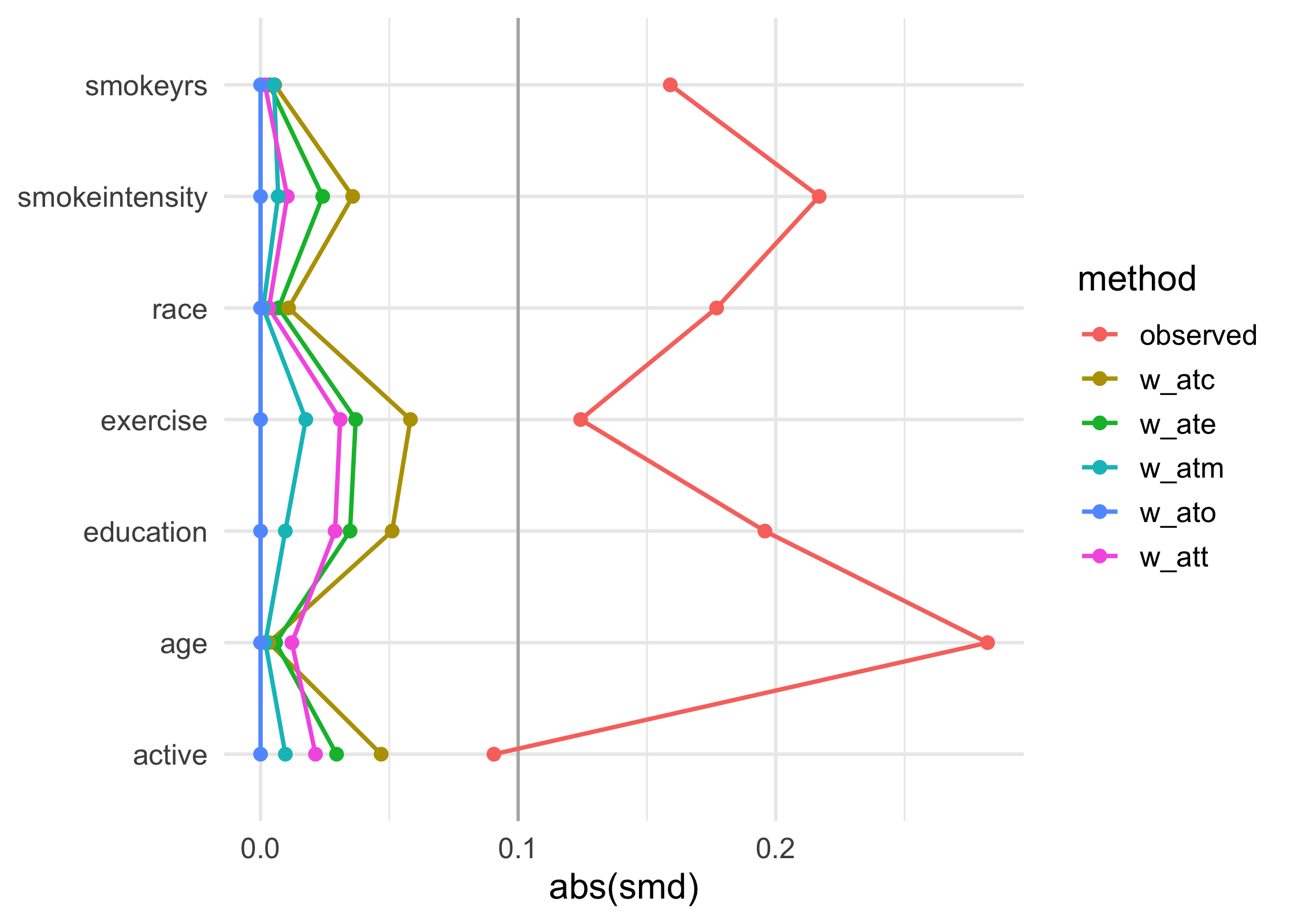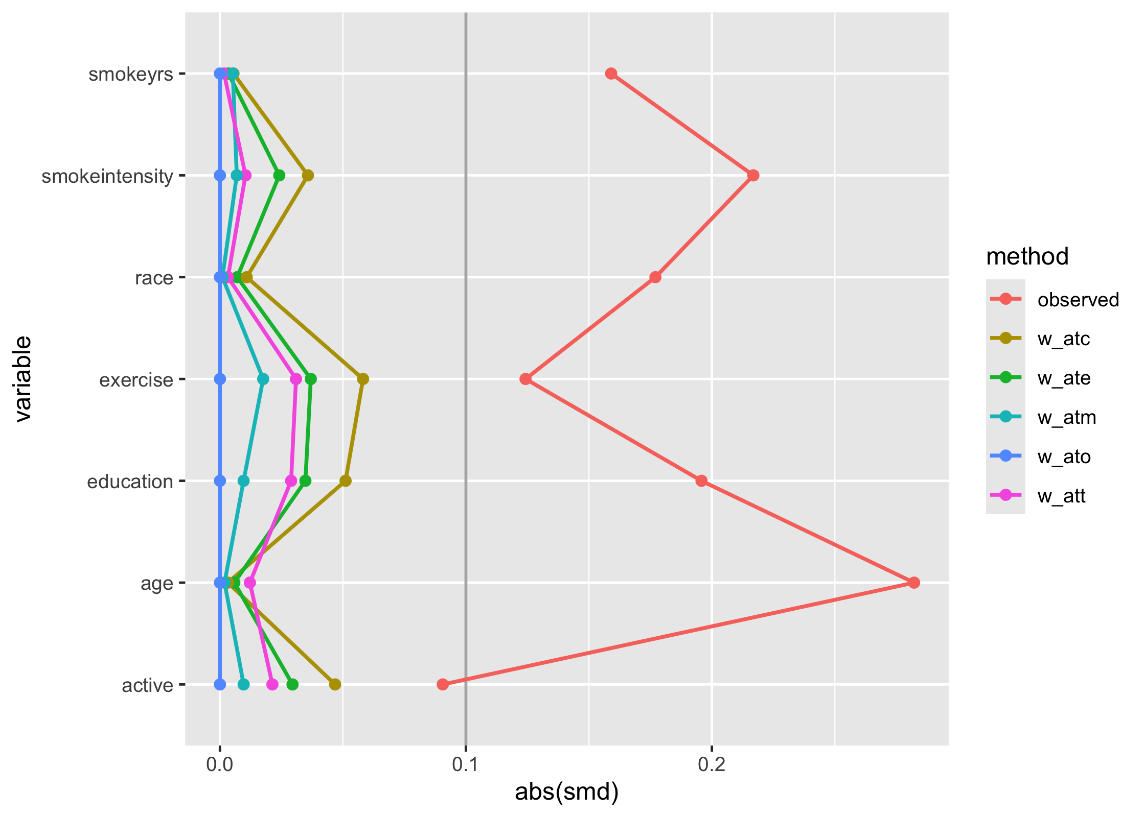 nhefs_weights contains several types of propensity score weights for which we can calculate SMDs. Unweighted SMDs are also included by default.