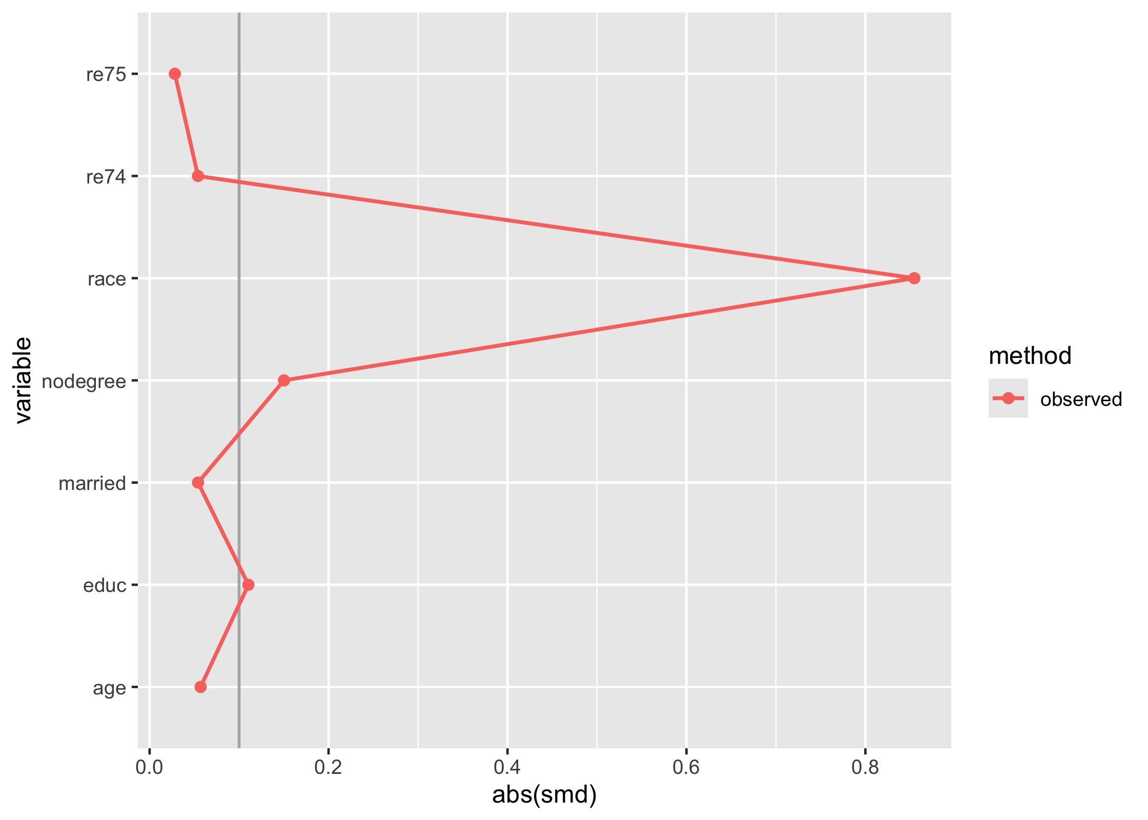 Having SMDs in a tidy format makes it easy to work with the estimates, for instance in creating Love plots. tidysmd includes geom_love() to make this a bit easier: