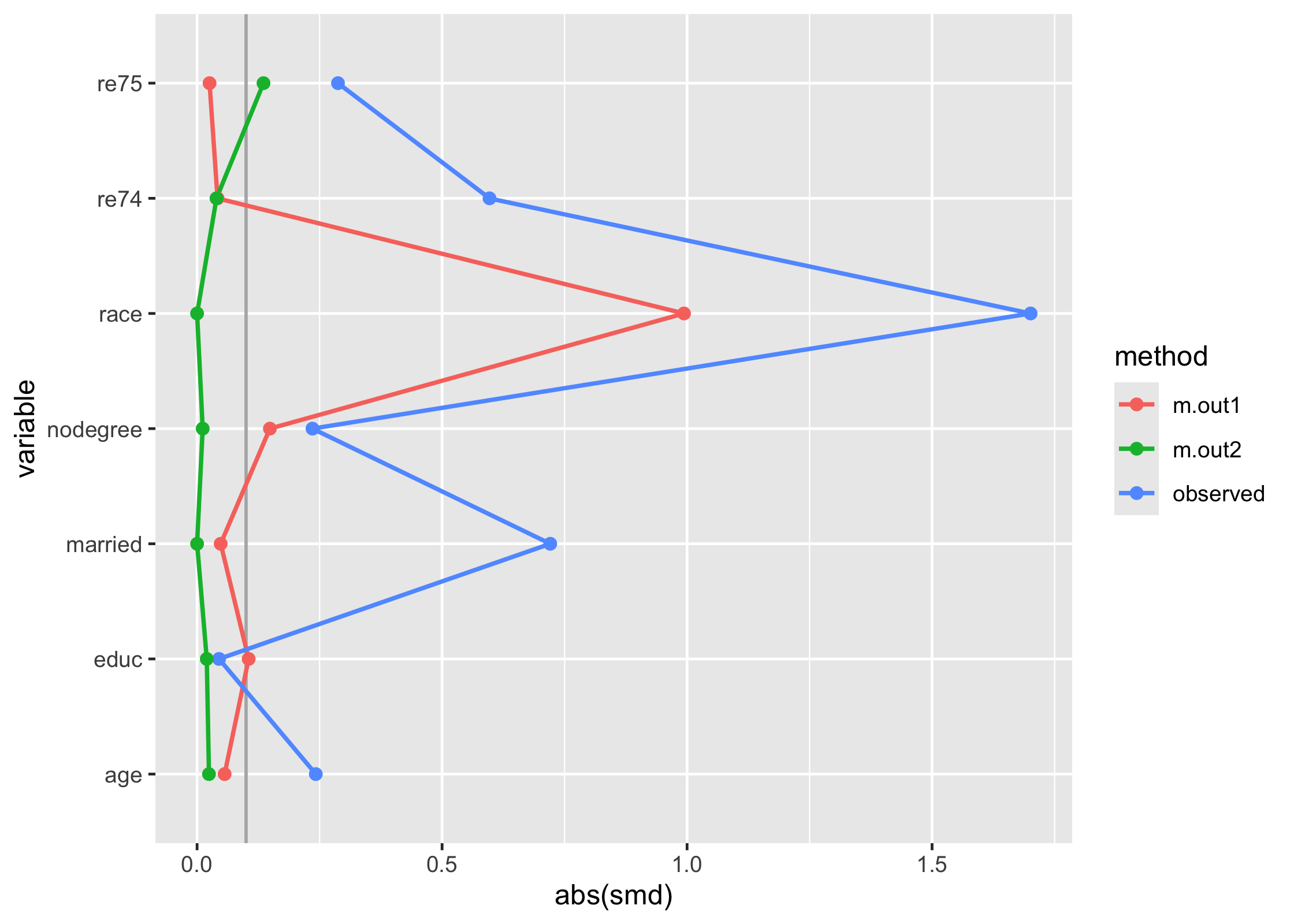 m.out2 <- matchit(treat ~ age + educ + race + nodegree +