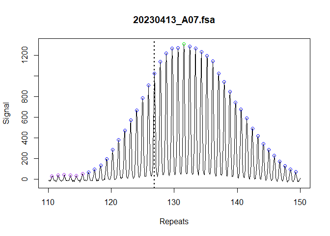 We can validate that the index peaks were assigned correctly with a dotted vertical line added to the trace. This is perhaps more useful in the context of mice where you can visually see when the inherited repeat length should be in the bimodal distribution.
