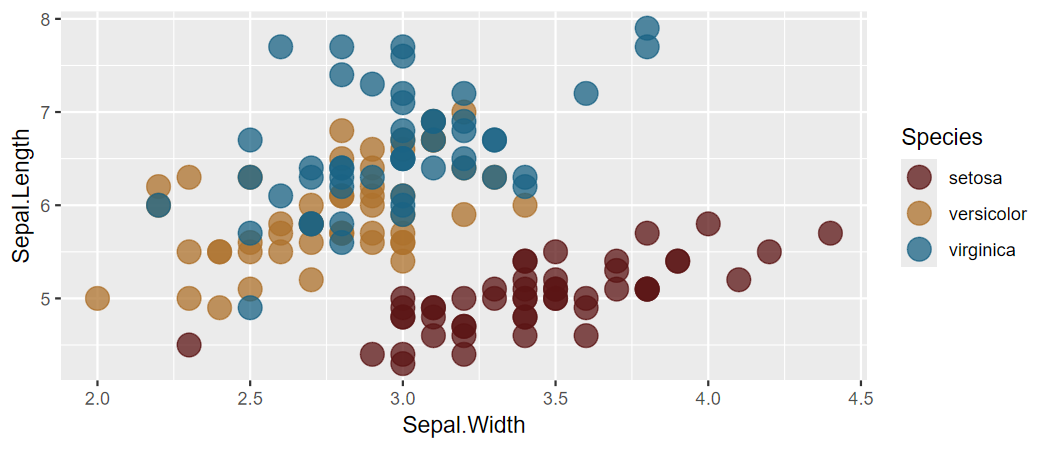p <- ggplot(iris, aes(Sepal.Width, Sepal.Length, color = Species)) +