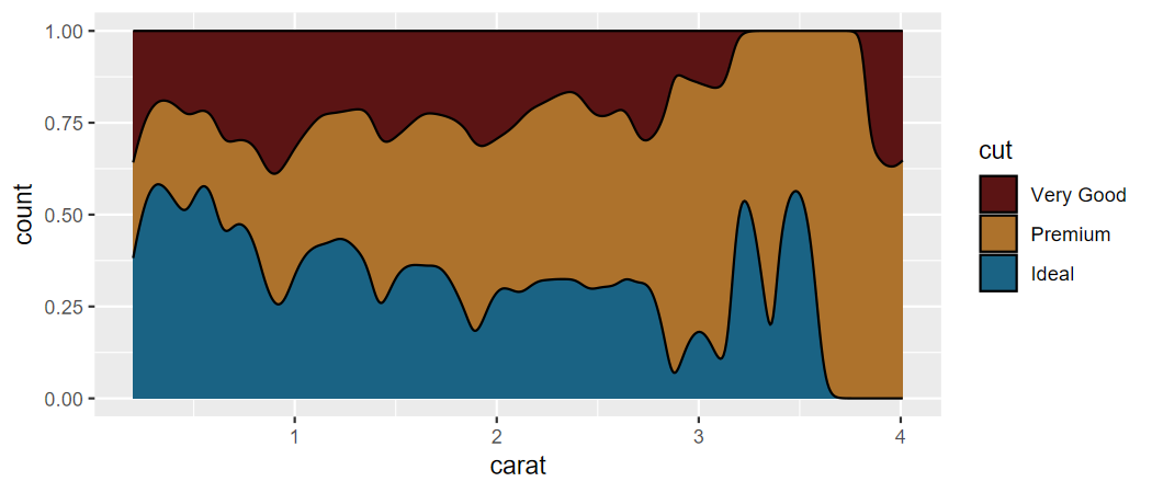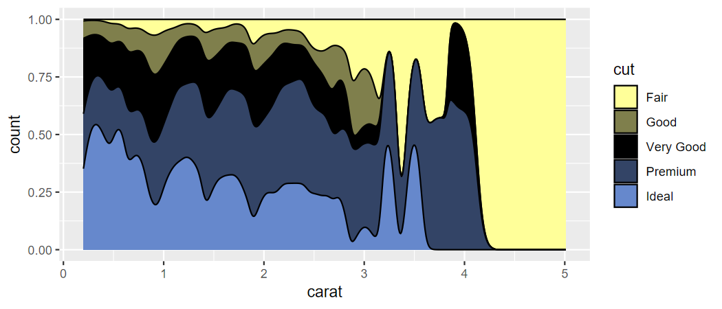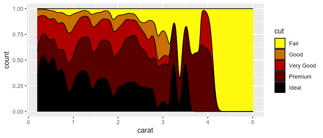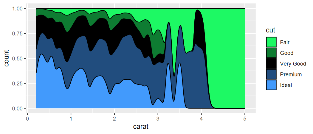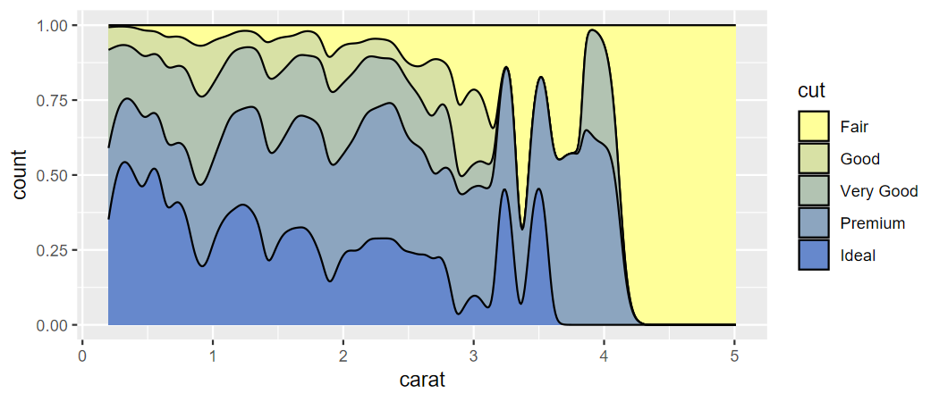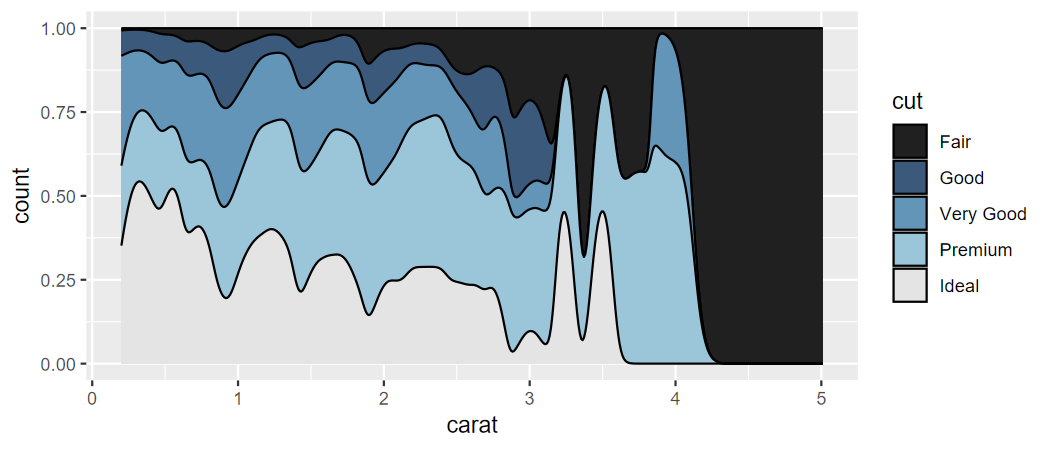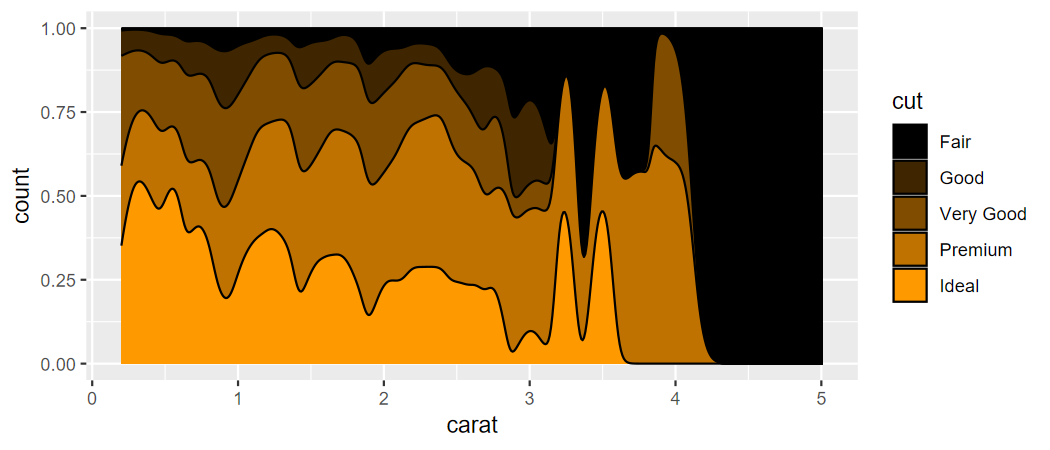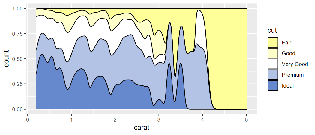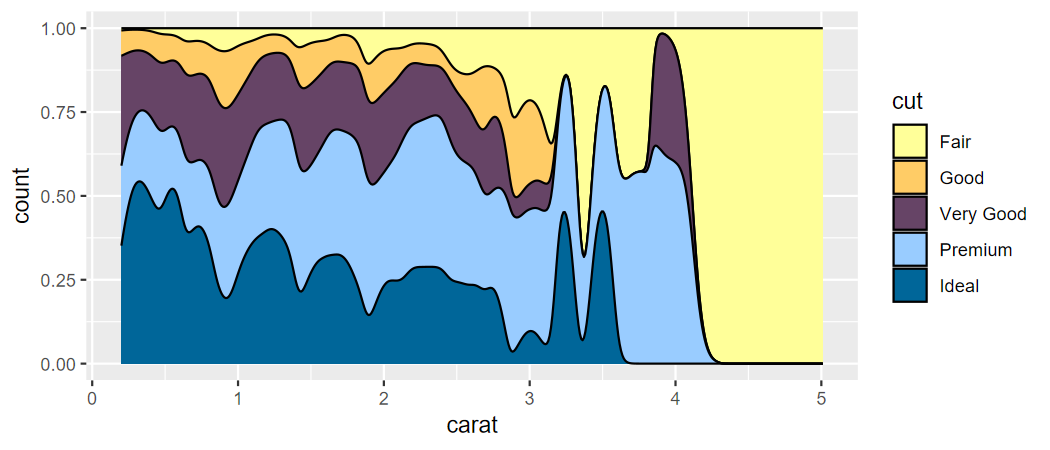 p <- ggplot(diamonds, aes(carat, stat(count), fill = cut)) +