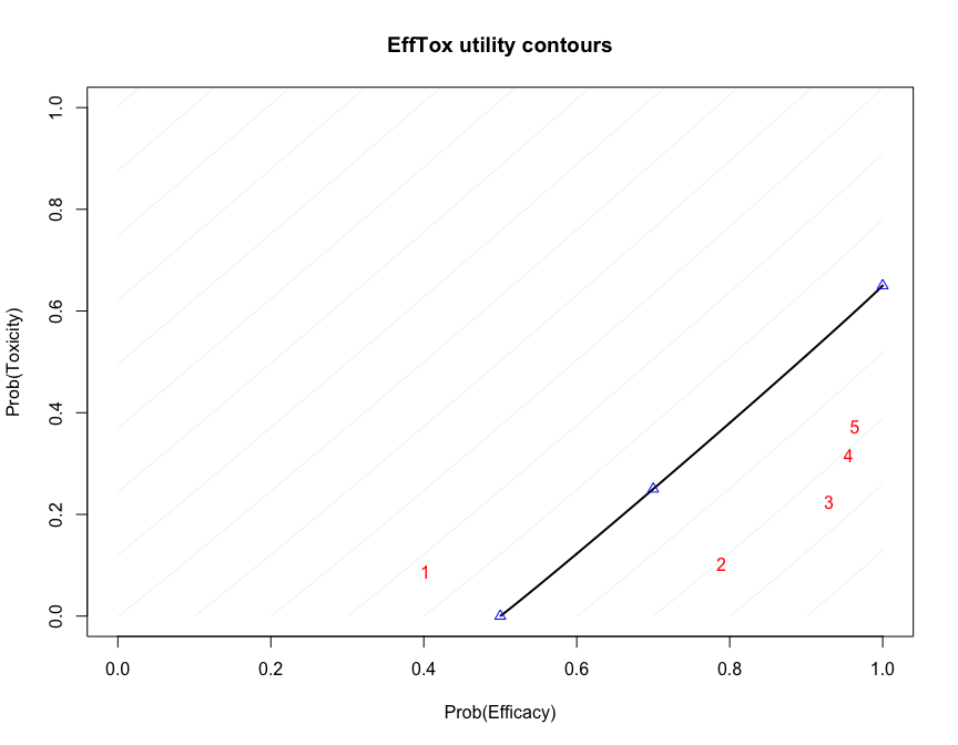 Functions are provided to create useful plots. For instance, it is illuminating to plot the posterior means of the probabilities of efficacy and toxicity at each of the doses on the trade-off contours used to measure dose attractiveness. The five doses are shown in red. Doses closer to the lower-right corner have higher utility.