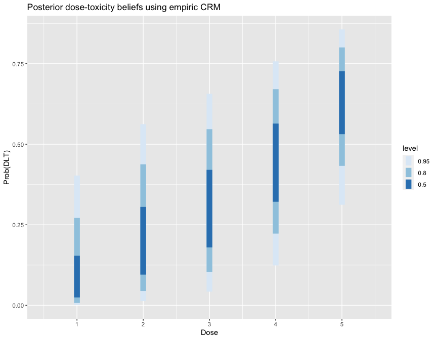 labs(y = 'Prob(DLT)', title = 'Posterior dose-toxicity beliefs using empiric CRM')