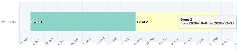 #> 2 Event 2 2020-10-01 2020-12-31 My Events from <b>2020-10-01</b> to <b>2020-12-31</b> #FFFFB3 1 1You want to use this for the intelligent y-axis assignment depending