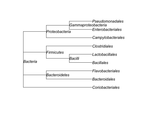 #>  [9] "Clostridia"            "Clostridiales"         "Coriobacteriales"      "Enterobacteriales"