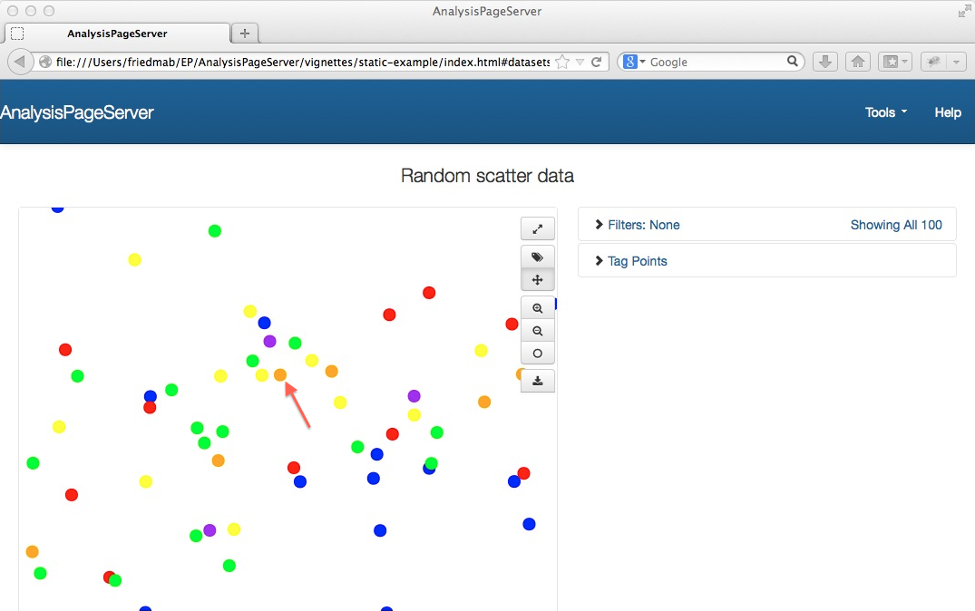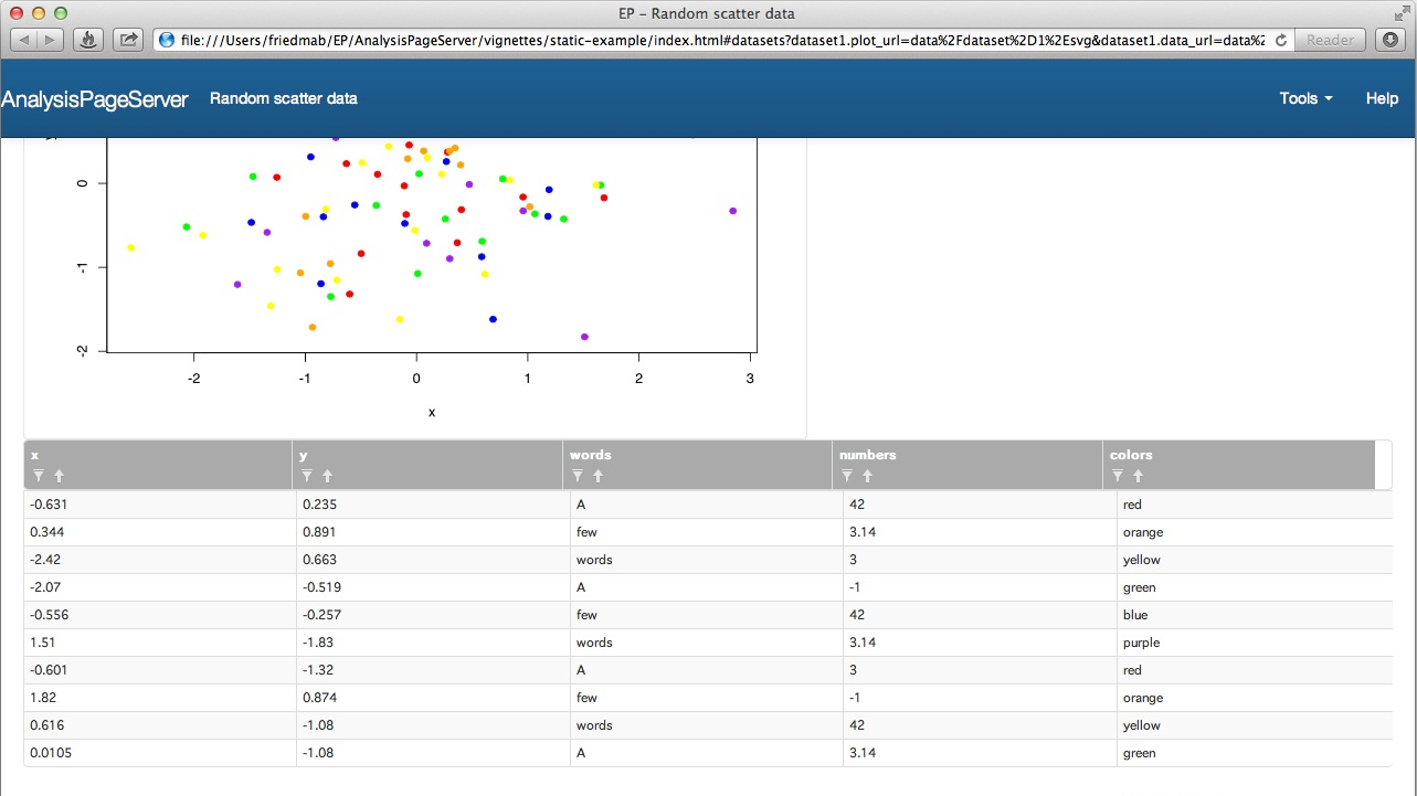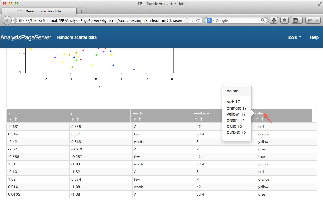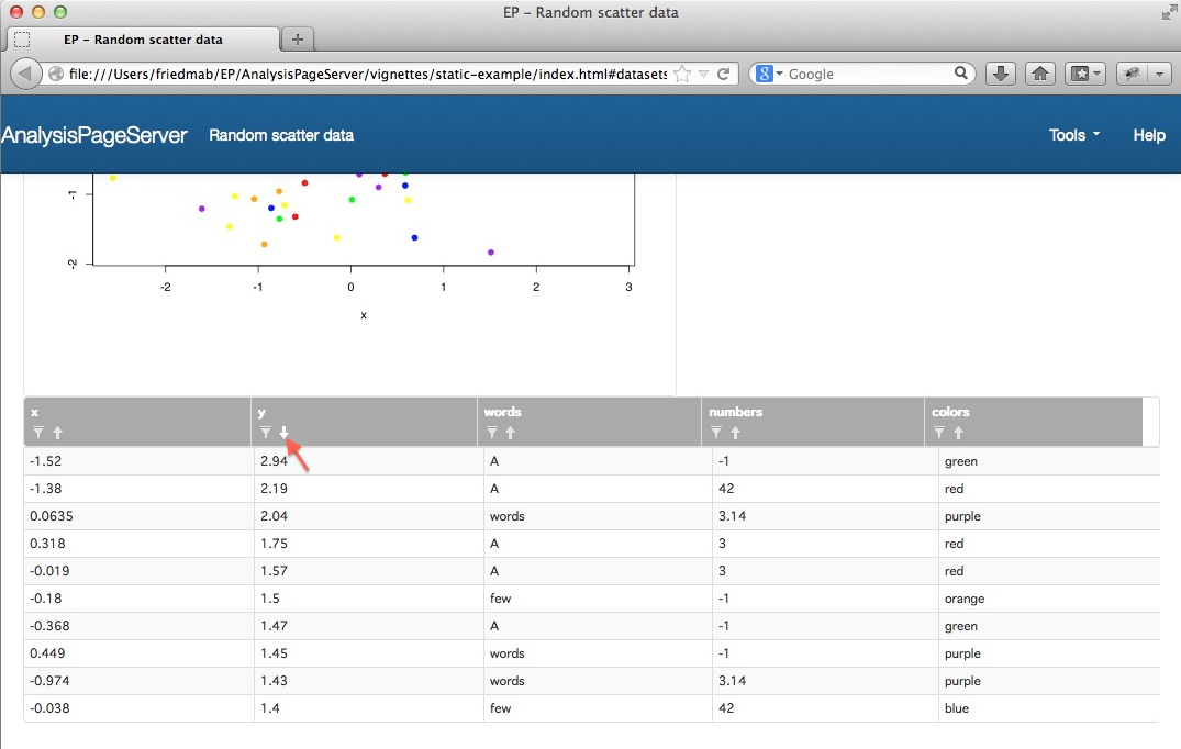 Not only does the AnalysisPageServer display your data and plot, it also implements sorting, numeric and text filtering, selecting and tagging points, zoom, full screen mode, and download. Using the example data set this document will walk you through each of these interactions.