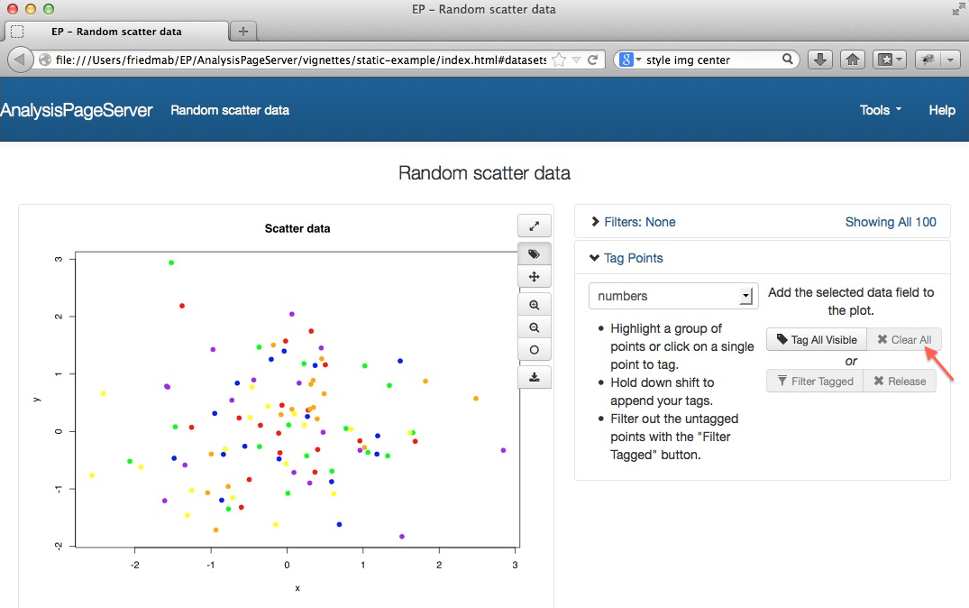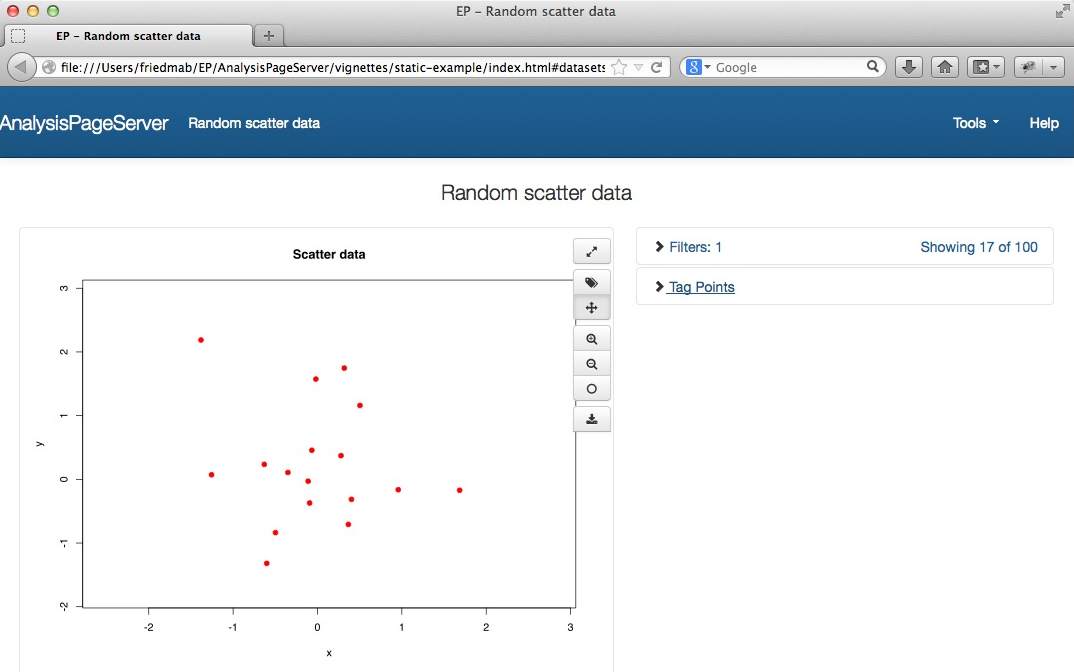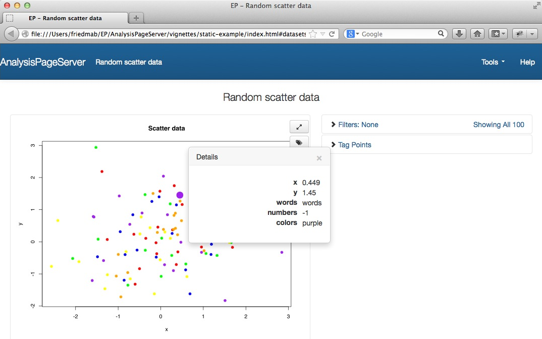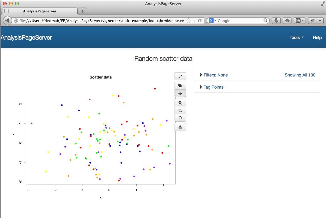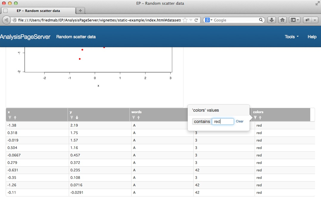 Not only does the AnalysisPageServer display your data and plot, it also implements sorting, numeric and text filtering, selecting and tagging points, zoom, full screen mode, and download. Using the example data set this document will walk you through each of these interactions.