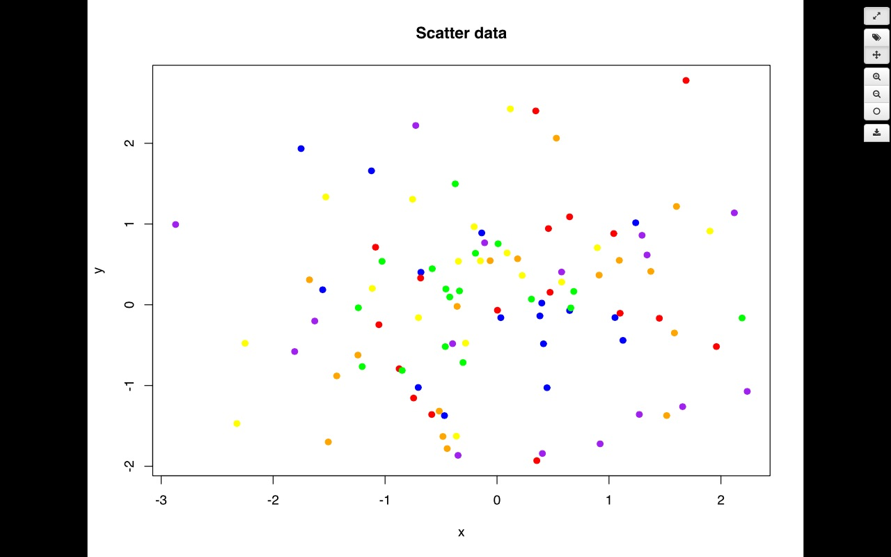 Note that by including the vector of colors in the data frame we can allow the user to filter based on the color of the points. Similarly, by including the x and y coordinates the user can filter on the position. See the next section for more on this, and also the section on tagging for a more intuitive way of filtering on point position.