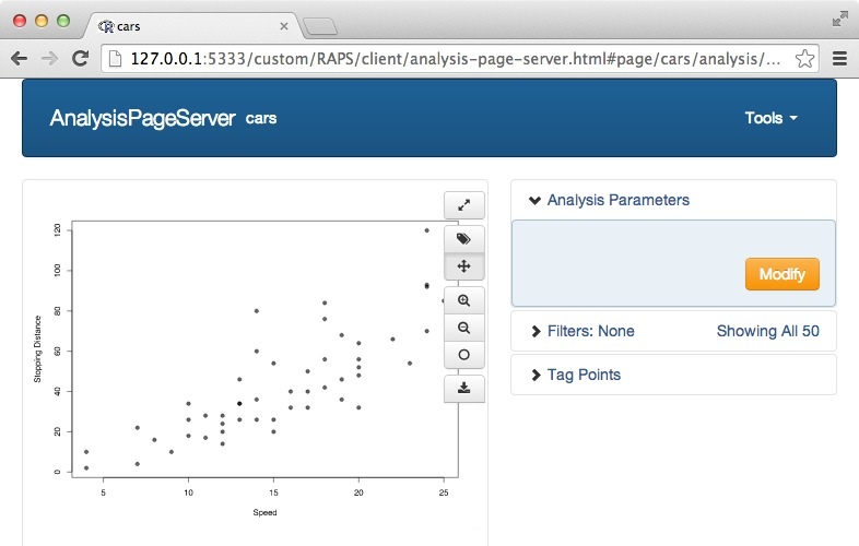 The interactivites discussed on the Interactivity documentation page, including roll-over, filtering, zooming, tagging and download, are all available with this deployment. Since they are described in detail there no more will be said about them here. What's new is the "Analysis Parameters" section, which is a condensed version of the primary parmeter area and lets the user see the inputs to the function. This section can also be used to repeat the analysis with modified parameters. First, click on Modify: