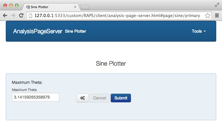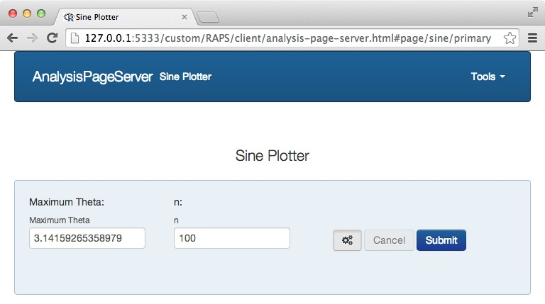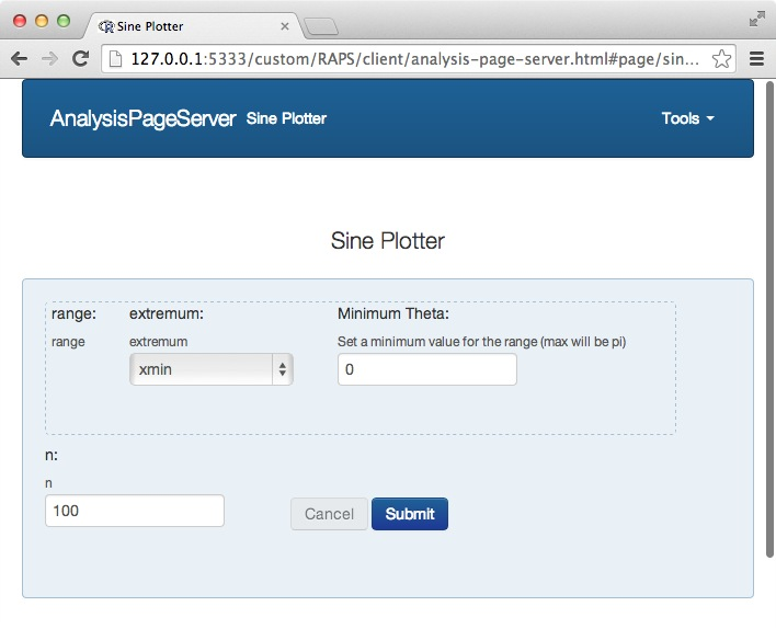 page <- new.analysis.page(handler, param.set = pset, name = "sine", label = "Sine Plotter")
