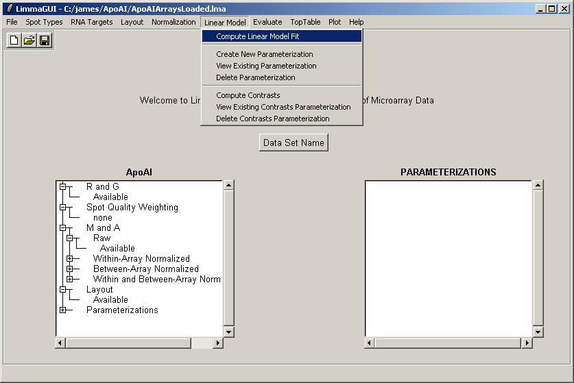 After loading ApoAIArraysLoaded.lma, it is evident that no parameterizations have been created yet.