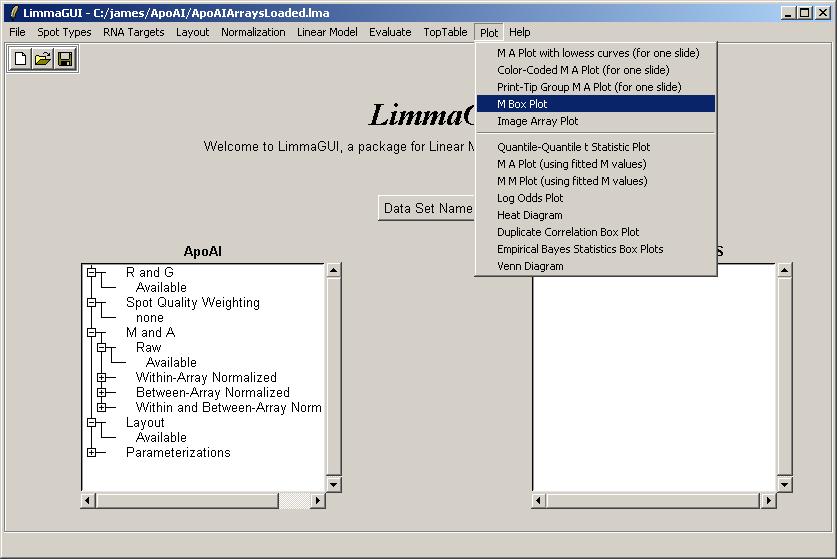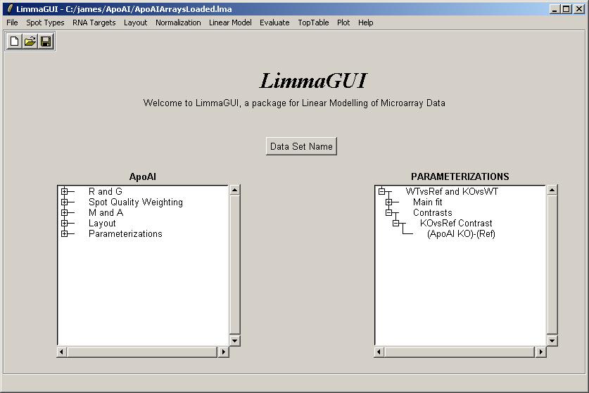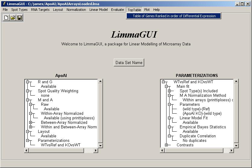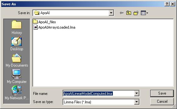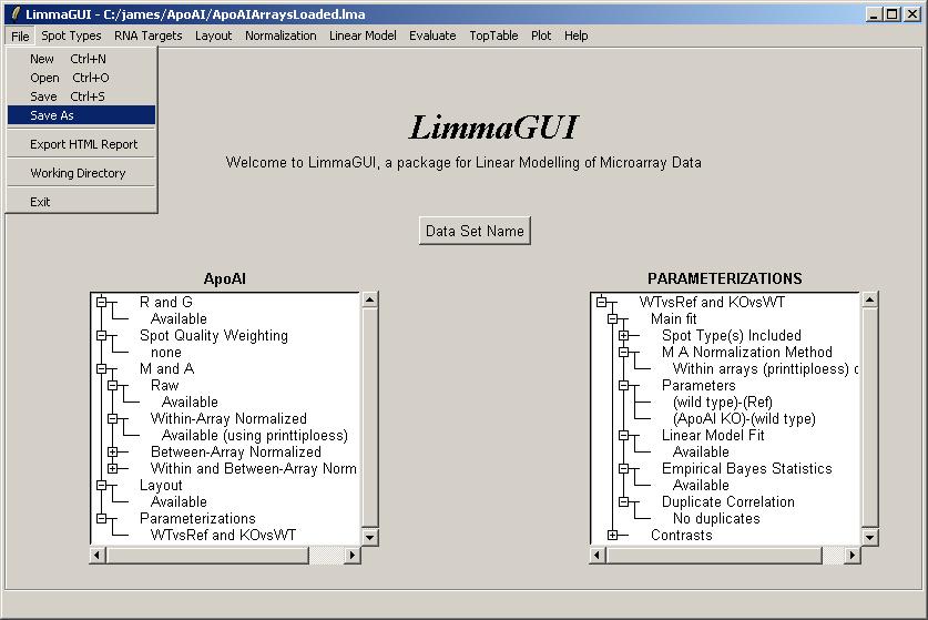 It is possible to save multiple Limma files with the same data set name (displayed above the left status window) but with different file names (displayed in the title bar).