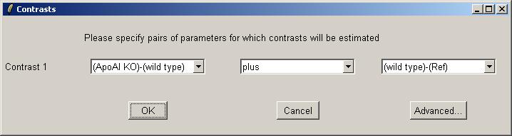 The interface for choosing contrast(s) is similar to the interface for choosing parameters for the linear model. You can click on the "Advanced" button if you want to enter a contrasts matrix directly. One difference is that in the simpler (non-matrix) interface, the user is allowed to use "plus" or "minus" to form a linear combination of two parameters, whereas the interface for choosing parameters only allowed a "minus" between the two RNA types. In this case we will add our two parameters to form the contrast KOvsRef.