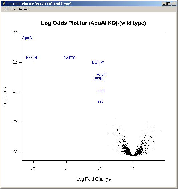 Now select "Log Odds Plot" from the Plot menu. (The B statistic displayed in the TopTable is an estimate of the log odds.)