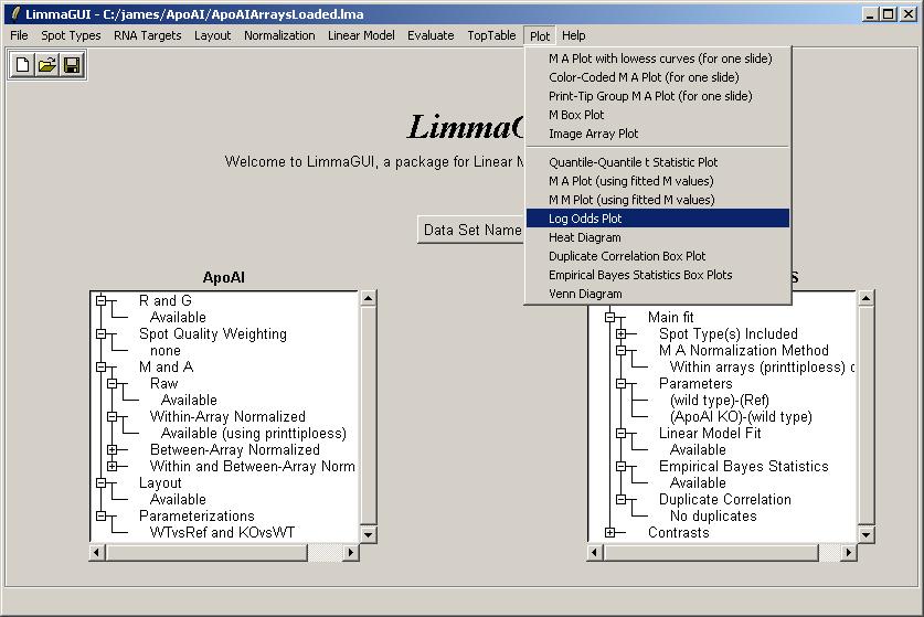 An M A plot with fitted M values can plotted obtained in the same way as the log odds plot, but by choosing "M A Plot(using fitted M values)" from the plot menu, instead of "Log Odds Plot".