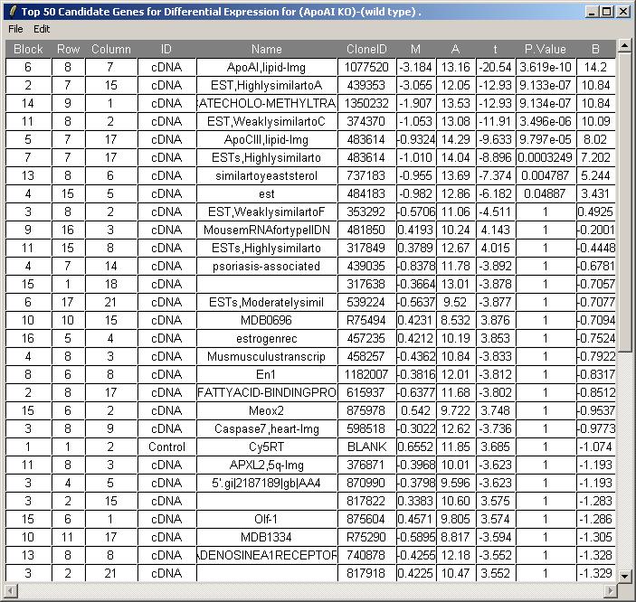 We will now request at a table of genes ranked in order of evidence for differential expression (more precisely, ranked by the B statistic, which estimates the log odds of differential expression for each gene). From the TopTable menu, select "Table of Genes Ranked in order of Differential Expression".