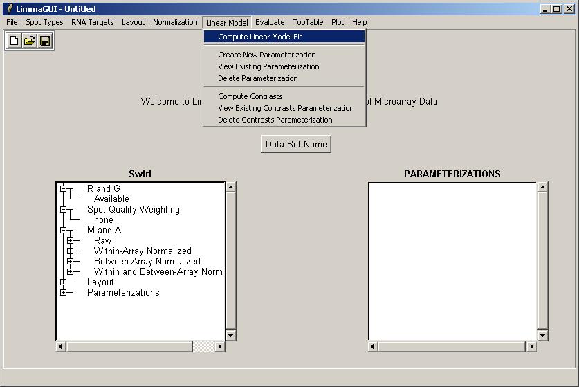 The first step of computing a linear model fit is creating a parameterization. If no parameterizations currently exist, limmaGUI will automatically prompt you to create a new parameterization after you click "Compute Linear Model Fit". (The first dialog boxes you interact with will be the same as if you had selected "Create New Parameterization" from the "Linear Model Menu".)