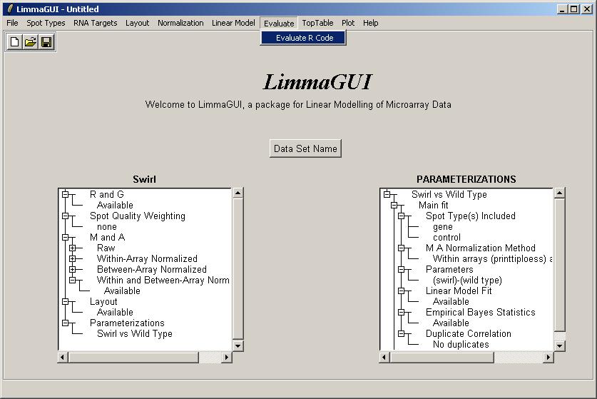Once the data set has been loaded, its name is displayed on top of the left status window. The status window shows that Red and Green background-corrected intensities (R and G) have been loaded, and that there is no spot-quality weighting. The data set name can be later modified with the "Data Set Name" button. The data set name is not the same as the file name, displayed in the title bar. For example, the same data set (Swirl) could be saved at two different stages of the analysis, e.g. SwirlArraysLoaded.lma and SwirlLinearModelComputed.lma.