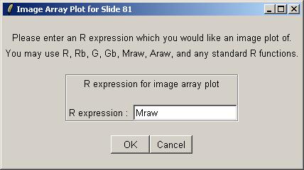 Leave the expression at its default value (Mraw), which will plot log red/green ratios for slide 81 using raw (unnormalized data). Advanced users will know from the discussion above that more complex expressions can be used here, possibly depending on M and A values normalized using different methods.