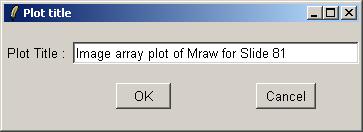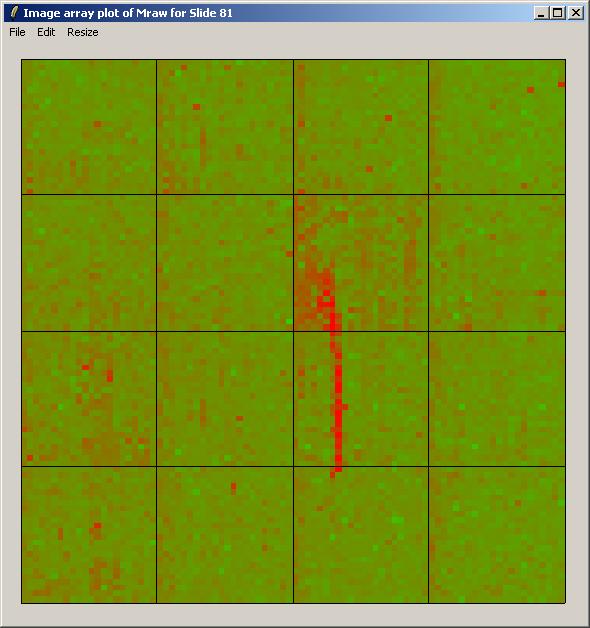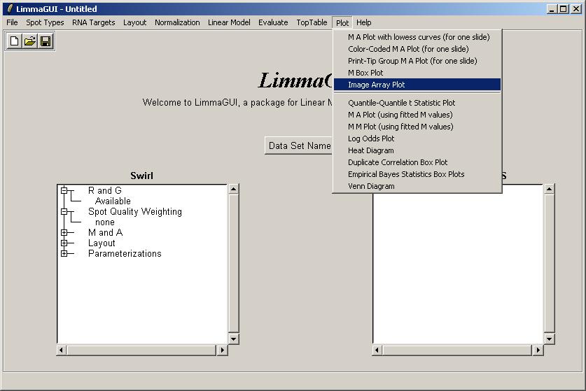Now choose "Slide 81". Advanced users, read on. It is actually possible to obtain an image array plot which depends on multiple slides if you understand the limma data structures (RGList and MAList), but usually this plot would be used for a single array. The status window on the left tells you which normalization-versions are currently available out of MAraw, MAwithinArrays, MAbetweenArrays, and MAboth. In the latest version of limmaGUI, normalization can be done using the "Normalization" menu, but this is not shown in the screenshots. When you plot a graph which asks you to choose between normalized and unnormalized M and A values, if you choose "normalized" and they are not yet available, then they will be calculated on the fly and the left status window will be updated to show that the normalized values are now available. The same is true if you select normalized M and A values when computing a linear model fit.