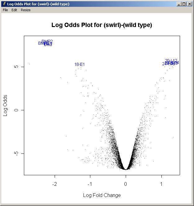 The log odds is another name for the B statistic, shown in the toptable. Again, choose the "Swirl vs Wild Type" parameterization, and the "(swirl)-(wild type)" parameter. Again, enter the number of gene labels you would like. The Log Odds plot is shown below.