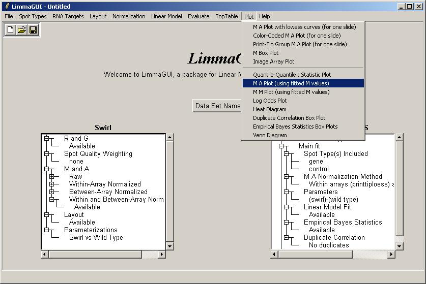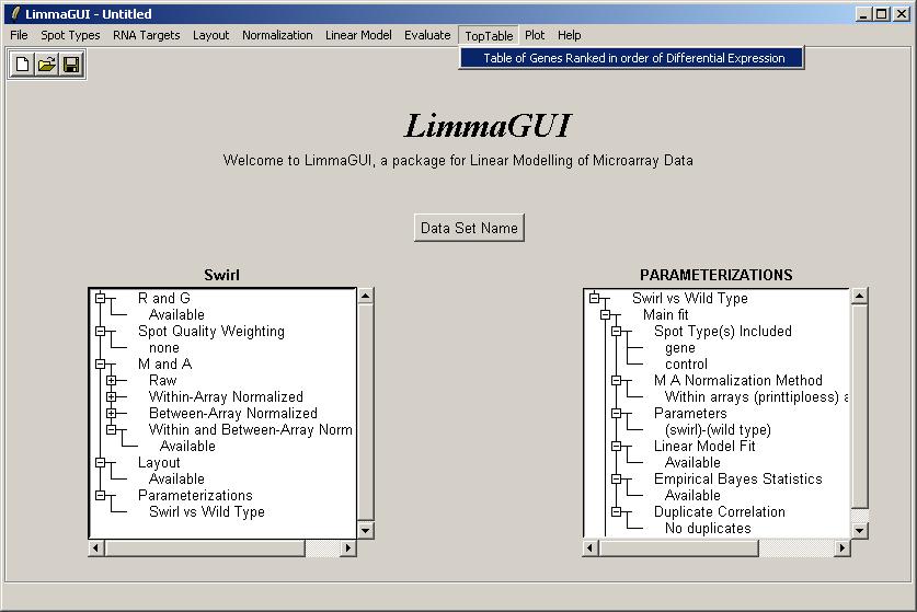 The limmaGUI main window is shown below.