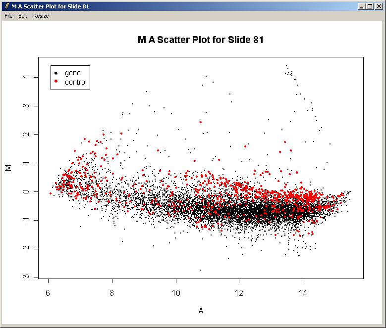 The resulting plot is shown below. There is clearly a need for normalization. There is an obvious intensity effect (i.e. M depends on A) which should be removed by normalization later on.