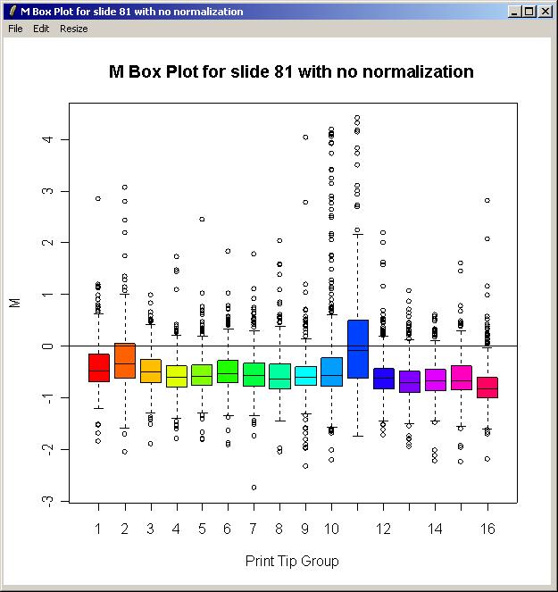 The resulting plot is shown below. Clearly there is some variation between the different print-tip groups, giving evidence that print-tip-group-based normalization methods are worthwhile.