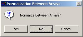 Choose "Yes" to normalize between arrays (i.e. click "Yes", which is NOT the default value). We choose to normalize between arrays in this case because of a reasonably significant difference in the range of M values for each array, as seen previously in a box plot.