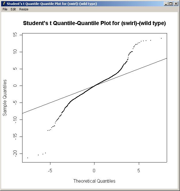 Again, choose the "Swirl vs Wild Type" parameterization, and the "(swirl)-(wild type)" parameter The Quantile-Quantile t Statistic plot is shown below.