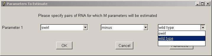 Now you can use the drop-down combo-boxes below to define parameters for the linear model to estimate, which are log differential expression ratios between RNA types found in the Targets file. limmaGUI will use the RNA combinations selected in the drop-down comboboxes to create a design matrix. Advanced users, can click on "Advanced" to enter the design matrix directly. Defining a parameter with RNAType1 "minus" RNAType2 means that a postive value of this parameter for one gene will mean that this gene is upregulated in RNAType1 relative to RNAType2. A very similar interface is used to define contrasts (when we have more than one parameter) and in that case the "minus" can also be a "plus". If you want full flexibility and understand what a design matrix is, then click on the "Advanced" button.