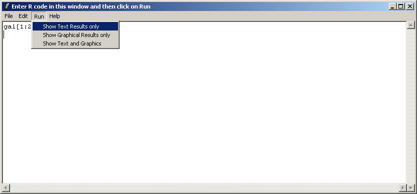 Users comfortable with entering R code directly can click on "Evaluate R code" from the "Evaluate" menu. From limmaGUI_0.5.3, it is also possible to enter R code in the R console from which limmaGUI was run. However, the R code evaluated within limmaGUI is automatically evaluated within limmaGUIenvironment, which contains objects for the data required by the current analysis, as distinct from the graphical widgets and other objects which will remain the same after loading a different data set.