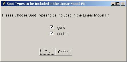Now you will be asked which spots to include in the linear model fit (for this parameterization). Often we would exclude the controls (e.g. Scorecard Controls) from the linear model fit, but here we have biological controls, so we will include them.