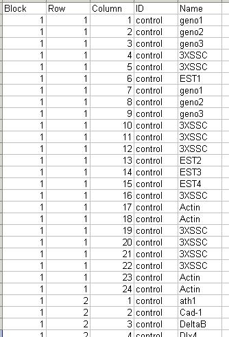 The arrays. The microarrays used in this experiment were printed with 8448 probes (spots), including 768 control spots. The array printer uses a print head with a 4x4 arrangement of print-tips and so the microarrays are partitioned into a 4x4 grid of tip groups. Each grid consists of 22x24 spots that were printed with a single print-tip. The gene name associated with each spot is recorded in a GenePix array list (GAL) file: