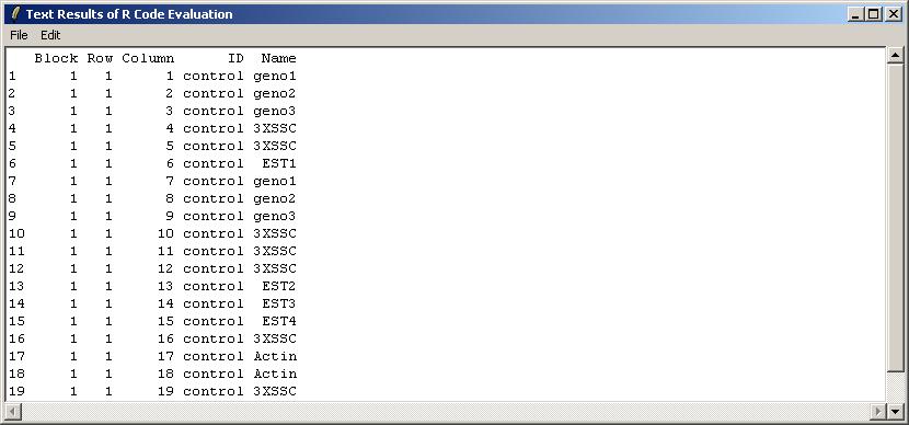 The user is presented with a text window in which R code can be entered. We will use this interface to check the first 20 rows of the GAL file, which is stored in an R object called "gal", within the environment limmaGUIenvironment. FOR ADVANCED USERS: When using the "Evaluate R Code" window, it is not necessary to use get("gal",envir=limmaGUIenvironment) because commands in this window are automatically evaluated in limmaGUIenvironment.