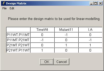 The design matrix from "designIA.txt" is now displayed in the table widget. Click OK to accept.