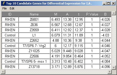 The resulting toptable is shown below. It can be saved as a tab-delimited text file, by selecting "Save As" from the File menu. The text file can then be imported into a spreadsheet program such as Excel. There does not appear to be strong evidence of differentially expressed genes, but this is really only a subset of the original data set, so the confidence statistics should not be taken too seriously.