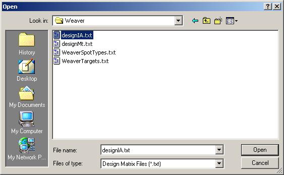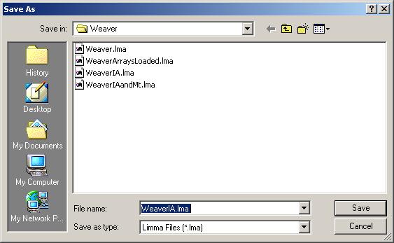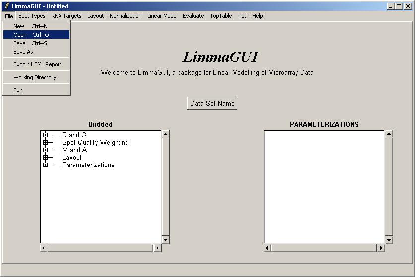 Open the file, WeaverArraysLoaded.lma. This file can be downloaded from the URL given above. Advanced users may be interested to know that a Limma (.lma) file is really just an RData file, so it can easily be loaded into an R session. However, it may appear more complicated than standard RData files associated with the limma package because it allows for multiple parameterizations and stores them in a list data structure.