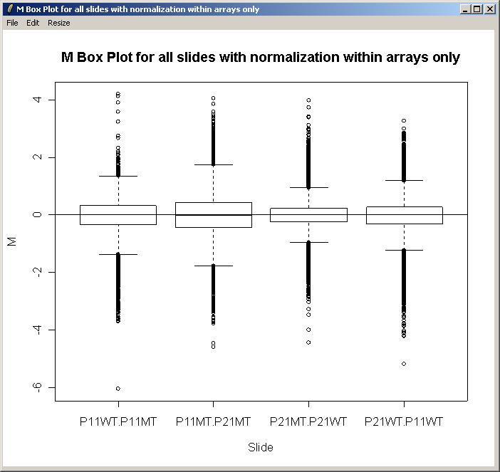 The resulting M box plot is shown below. There are no significant differences in scale between the arrays, so we will not normalize between arrays for this data set.