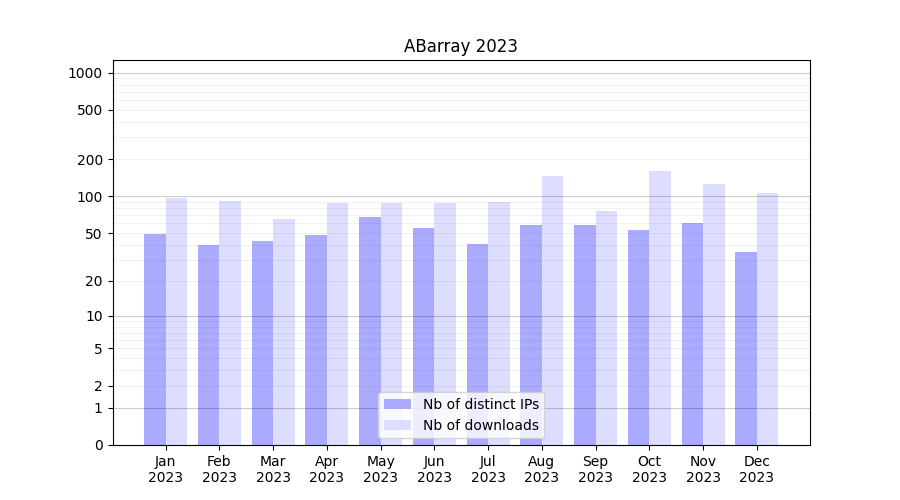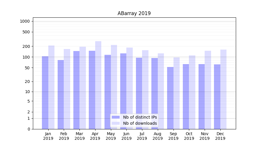 Number of downloads for software package ABarray, year by year, from 2025 back to 2014 (years with no downloads are omitted):
