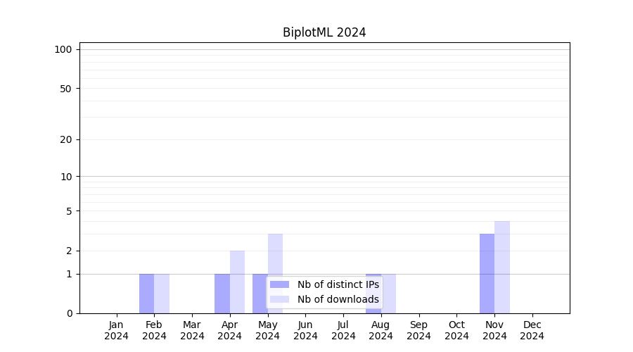 Number of downloads for software package BiplotML, year by year, from 2025 back to 2014 (years with no downloads are omitted):