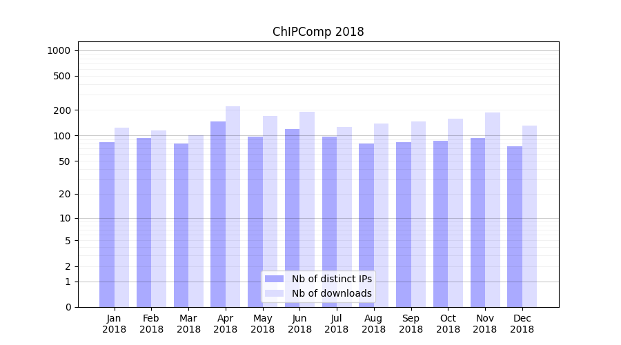 Number of downloads for software package ChIPComp, year by year, from 2025 back to 2014 (years with no downloads are omitted):