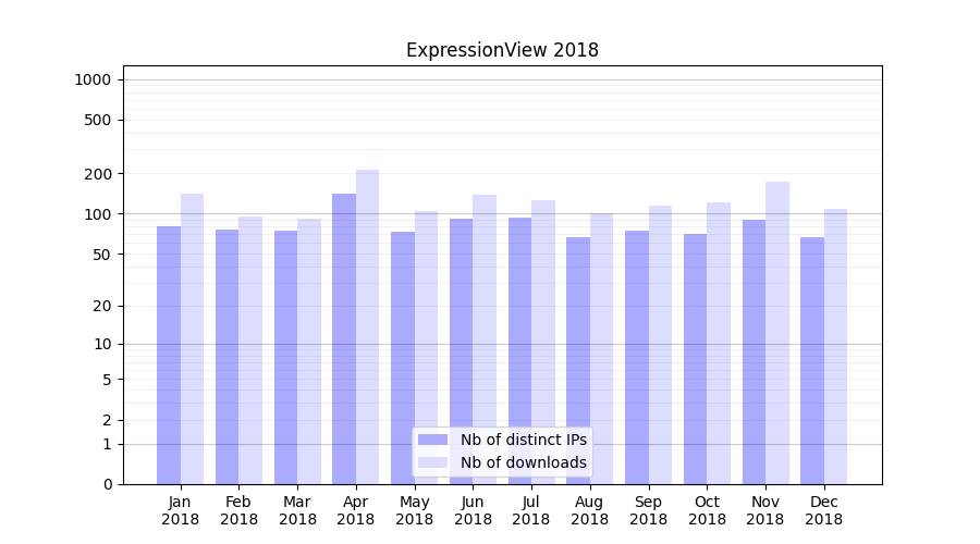 Number of downloads for software package ExpressionView, year by year, from 2025 back to 2014 (years with no downloads are omitted):
