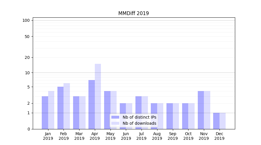 Number of downloads for software package MMDiff, year by year, from 2025 back to 2014 (years with no downloads are omitted):